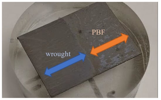 A specimen was also prepared for visual analysis via microscopy. The microscopy specimen was cut on a wire EDM (electrical discharge machining) with the boundary between the PBF and wrought material centered on the face. The specimen was placed in an epoxy puck, ground progressively to 1200 grit sandpaper, polished with diamond paste and alumina, and then etched using a Carpenter 300 Series stainless steel etchant. The specimen was also prepared for electron backscatter diffraction (EBSD) by the polishing routine described above, followed by an electropolish in a perchloric acid–methanol solution and a polish with colloidal silica. The etched microscopy specimen is shown in Figure 3. The finished microscopy specimen was viewed under a microscope at 32× and 63× magnification. EBSD scans were performed using an S-FEG XL30 FEI microscope (ThermoFisher Scientific, Hillsboro, OR, USA). EBSD patterns were collected and processed using EDAX’s OIM Data Collection v. 7 (Ametek, Mahwah, NJ, USA).
