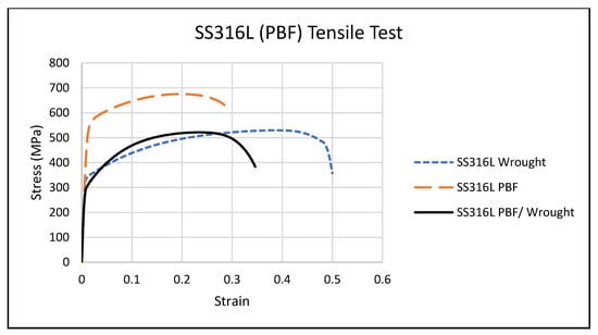 - The yield and ultimate tensile strengths of the SS316L PBF material were significantly greater than that of the wrought material of the same alloy (550 and 680 MPa for the PBF material, compared to 320 and 530 MPa for the wrought material).
