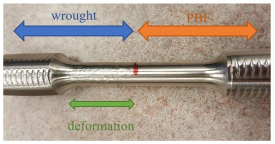 Table 2 shows the average yield strength () and ultimate tensile strength () for the wrought, PBF, and PBF/wrought specimens. Table 3 shows the statistical analysis (α = 0.05) that the differences in and between the PBF specimens and the two other groups to be significant.