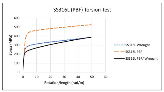 Figure 6 shows the average stress profiles of SS316L in torsion for the two wrought, three PBF, and three PBF/wrought specimens. The wrought and PBF/wrought specimens performed similarly, while the PBF specimens exhibited a much higher . Table 4 shows the average torsional shear strength () and shear modulus () for the wrought, PBF, and PBF/wrought specimens.