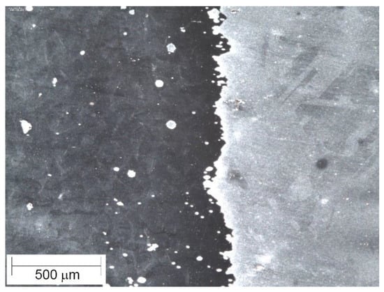 Optical microscopy was used to examine the interface between the PBF and the wrought 316L, while also allowing for the characterization of grain size. Figure 7 shows a representative image of the interface in the PBF/wrought 316L specimen. Formal analysis of void content was not carried out, but the micrograph in Figure 7 (at 63× magnification) shows no evidence of voids at the interface or in the PBF material.