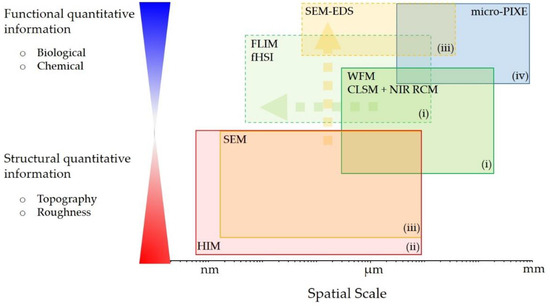 The experimental workflow phase diagram comprising complementary imaging and spectroscopy techniques (i–iv) to cover wide spatial range and to gain both functional and structural information on the investigated system. For more detailed instrumentation see Figures S1–S3 in the Supplementary Materials.