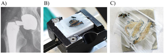 Collection and preparation of periprosthetic tissue slices for multimodal and multiscale analysis. (A) X-ray image from fractured modular neck (B) paraffin embedded periprosthetic tissue placed in the microtome (C) microtome sectioned tissue slice over the aluminium frame with mylar window.