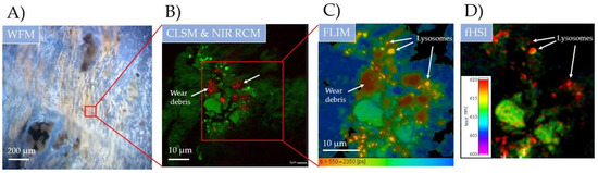 Wear debris identification and its impact on the surrounding biological molecular environment in the periprosthetic tissue on submicron scale using multimodal spectroscopy-based optical imaging. (A) widefield fluorescence microscopy (WFM) using LED source (λ = 400 nm); (B) hybrid LSCM and NIR CRM (λ = 561 nm and λ = 780 nm); (C) fluorescence lifetime (FLIM) and (D) hyperspectral fluorescence imaging (fHSI) using 16-channel PMT detector and fast TCSPC electronics (both λ = 561 nm). For more detailed FLIM and fHSI analysis see Figures S4 and S5 in the Supplementary Materials.