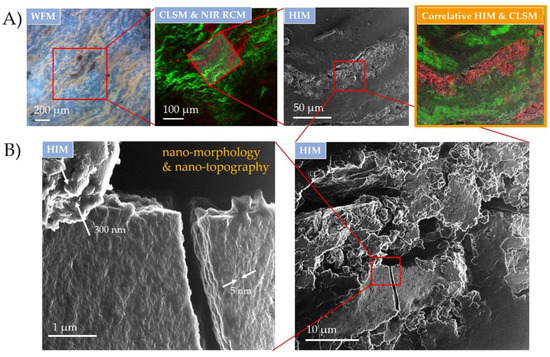 Surface topography of inflammatory wear debris distributed in periprosthetic tissue characterized down to nm scale using correlative HIM and optical CLSM and NIR RCM. (A) CM registration and overlap of wear debris site in the tissue sample on a micron scale; (B) wear debris surface nanotopography using HIM with distinct features from a few nm to a few hundred nm in size indicated with the white arrows. Excitation sources: WFM (LED; λ = 400 nm); CLSM and NIR RCM (λ = 561 nm and λ = 765 nm) and HIM SE (30 keV He ion energy with 1.7 pA ion current and 2 nm pixel step size).