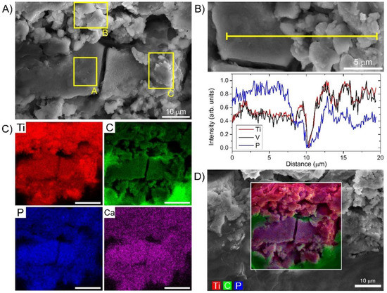 SEM-EDS analysis of Ti alloy wear debris with different local topographical features. (A) SEM image with the marked three distinct topographical regions; (B) SEM-EDS cross-section of Ti, V and P elemental concentration through these regions; (C) SEM-EDS overlay of three abundant elements, Ti from the alloy, P from the adsorption and C from the surrounding tissue; (D) EDS maps for four abundant elements, C, P, Ca and Ti.