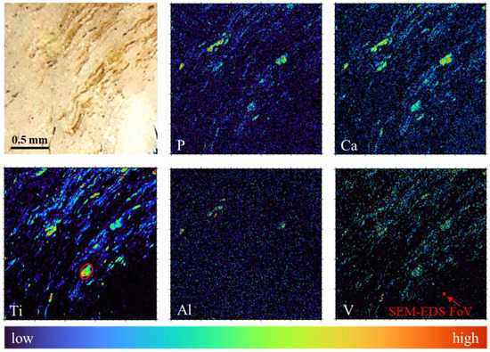 To better characterize Al and V leaching on a wider field-of-view with approximately 10 times better sensitivity, the tissue specimen was eventually transferred to the micro-beam endstation for performing micro-PIXE measurements. Elemental maps of the tissue using Micro-PIXE are shown in Figure 6. These maps were obtained using GeoPIXE 7.5 software [62] (CSIRO, Australia), which allows the univocal elemental characterization of the features observed with optical microscopy. The main elements constituting the alloy, Ti, V and Al, were identified throughout the tissue in the shape of heterogeneous debris of sizes ranging from 200 µm down to the µm lateral resolution limit.