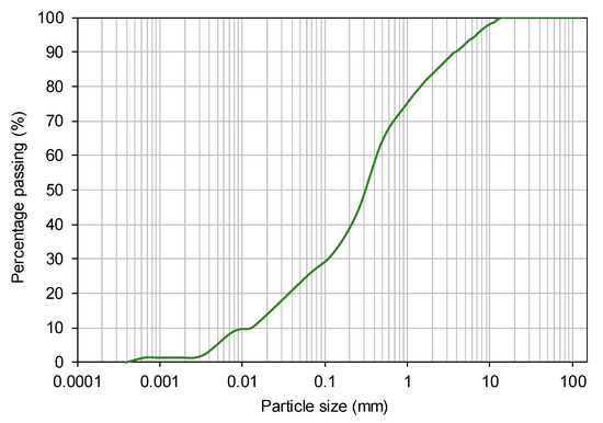 The particle size distribution of the recycled C&D material was evaluated by sieving and sedimentation in accordance with the EN 933-1:2012 [36] and CEN ISO/TS 17892-4:2016 [37] Standards (Figure 2). The optimum compaction parameters (i.e., optimum moisture content, wopt and maximum dry unit weight, γdmax) were determined using the standard Proctor test, following the EN 13286-2:2010 [38]. The main physical properties of this recycled material are presented in Table 2.