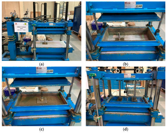 Large-scale direct shear apparatus and test procedures: (a) Geotextile specimen fixed to the lower box; (b) Upper box positioned over the geotextile; (c) Upper box filled with compacted recycled C&D material; (d) Direct shear box ready for testing.