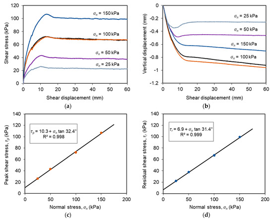 The peak and residual shear strengths mobilised at the studied interface when subjected to a constant displacement rate, and different normal stresses are illustrated in Figure 4c,d, respectively, along with the corresponding linear best fits (Mohr-Coulomb strength envelopes) and respective equations. The interface peak shear strength can be characterised by a friction angle (δ) of 32.4° and adhesion (ca) of 10.3 kPa, whereas the residual shear strength can be characterised by a slightly lower friction angle of 31.4° and adhesion of 6.9 kPa.