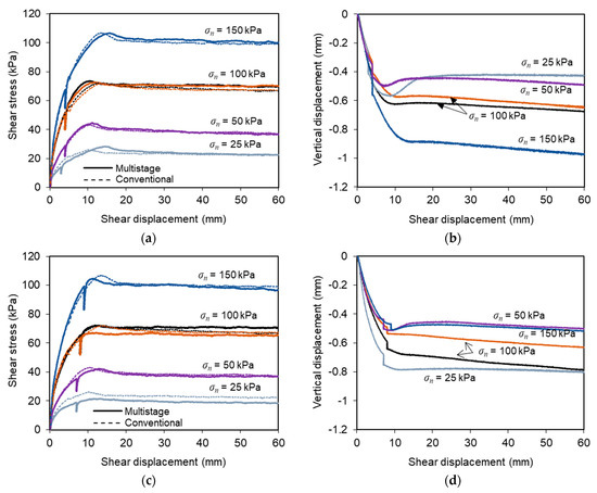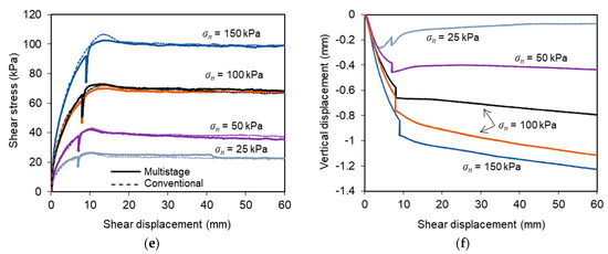 The vertical displacements recorded during the multistage tests (Figure 5b,d,f) showed that the specimens experienced some additional vertical settlement during the stress relaxation stage, which was mobilised at a relatively slow rate. The specimens mainly exhibited a contractive behaviour during shearing, with the maximum settlement at the end of the tests ranging from 0.07 to 1.23 mm under different test conditions. These values are relatively similar to those reached at the end of the conventional tests performed under constant displacement rate and varying normal stresses (0.27 to 0.97 mm).