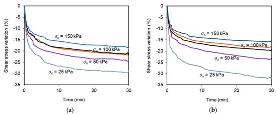 Figure 6 plots the percent variation of shear stress recorded during the multistage tests when the shear box was restrained from any movement for 30 min (tests T-6 to T-15; Figure 6a,b) or 120 min (tests T-16 to T-20; Figure 6c). Figure 6a is related to a displacement dr = 1/3 dmax, whereas Figure 6b,c are related to a displacement dr = 2/3 dmax.