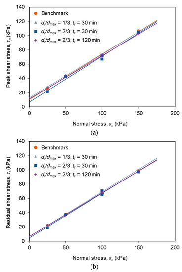 Regardless of the shear displacement dr, the shear stress decreased at a faster rate at the beginning of the stress relaxation stage, and then, the rate of stress decay reduced progressively over time. Beyond the initial 30 min, the additional stress reduction was almost negligible (Figure 6c). It can also be observed that the percent reduction of shear stress, recorded during the stress relaxation stage, became more pronounced as the normal stress was progressively decreased. For instance, for dr/dmax = 1/3 and tr = 30 min (Figure 6a), the shear stress decreased by up to 30% under the normal stress of 25 kPa, whereas an 18% stress reduction was observed under the normal stress of 150 kPa. This finding suggests that the time-dependent phenomena, taking place at the studied interface, are more pronounced under lower normal stress values.