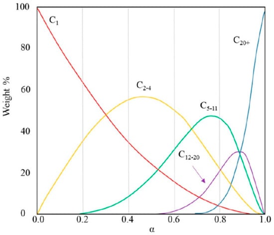 Compared to conventional petroleum processing, products of Fischer–Tropsch synthesis do not contain salts, heavy metals, sulfur, nitrogen, or aromatic compounds. As a result, this technology has the potential to become a suitable technology for biomass processing. However, one disadvantage is the higher operating cost compared to the cost of processing oil [21]. There are various models for controlling Fischer–Tropsch synthesis with a focus on the production of hydrocarbons of the desired products. The most widespread and simplest model is the mathematically described distribution model of polymerization called Anderson–Schulz–Flory, also called “ASF-plot”. In this distribution model, FT synthesis is modeled as an addition polymerization reaction with a probability of α chain growth [24]. The resulting product distribution is shown as a graph of the logarithmic molar fraction of hydrocarbon chain growth and has a linear dependence (Figure 1).
