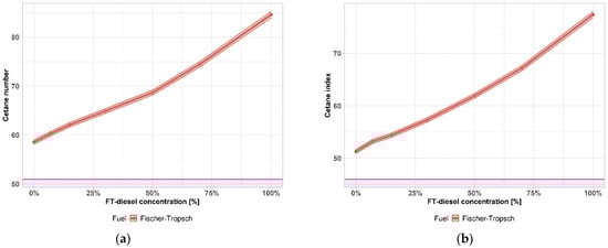 Figure 2a,b shows the change in cetane number and cetane index as a function of the FT-diesel concentration. The cetane number characterizes the ability of diesel to ignite, otherwise called reactivity. The reactivity is manifested by a delay between the injection of fuel into the cylinder and the increase in the pressure in the cylinder, after the ignition of the mixture, to a maximum value. The greater the reactivity of the fuel, the more regular and perfect its combustion and consequently the operation of the engine.