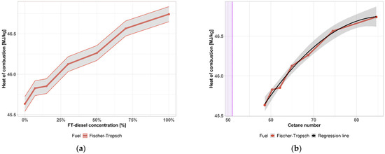 (a) Heat of combustion of FT-diesel mixtures; (b) regression function of heat of combustion as a function of cetane number.