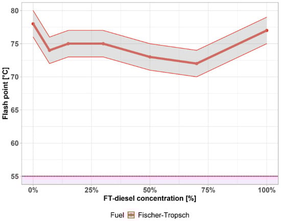 Another important measured parameter is the flash point. The flash point values of diesel are usually between 58 °C and 75 °C. The flash point of winter diesel is lower than in summer classes. Flammable liquids are classified in a hazard class. According to the EN 590, the minimum value of the flash point of diesel has to be higher than 55 °C, which characterizes it as a Class II, shown by the purple area. The values of the flash point of pure diesel are usually between 58 °C and 75 °C. Results in Figure 4 show that the FT-diesel in conventional diesel does not change the flash point much so that the values are above the limit in the whole range of measured concentration. The gray area represents the 1 °C accuracy of the measurement. The flash point is important for safety and determines the values that are required for handling, storage, transport, and classification, but at these temperatures (Figure 4), does not affect the combustion process and engine properties.