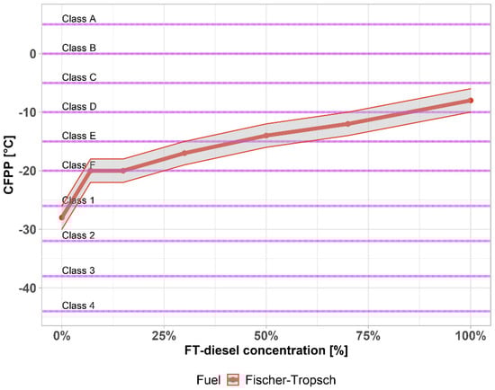 Increasing the concentration of FT-diesel also increases the cold filter plug point. Figure 5 shows the CFPP with 1 °C accuracy, together with the highlighted climate-related requirements on diesel fuels. Base diesel fuel complies with all temperate climates and Class 0 and 1 of arctic or severe winter climates. The addition of FT-diesel also increases the temperature of CFPP. Class F is not satisfied around 15%, Class E around 50%, and Class D around 85%.