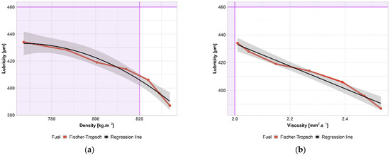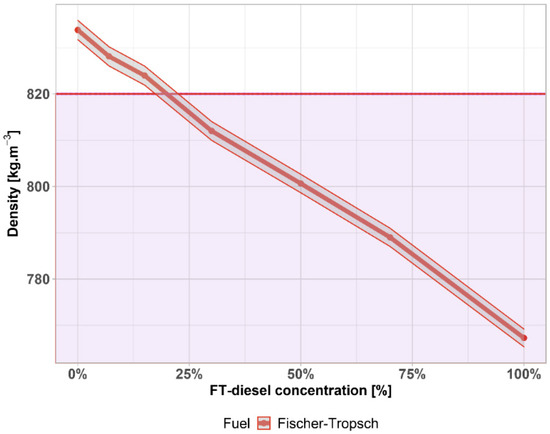In the case of the density of FT-diesel (in Figure 6), there is a significant linear drop going under the limit, the lowest admissible density is 820 kg·m−3 at 15 °C—shown by the purple area. This limit is exceeded around 21%. The gray area represents the 0.25% accuracy of the measurement.