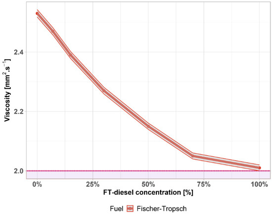 According to the results of kinematic viscosity depicted in Figure 7, the influence of FT-diesel is quite significant. The requirements given in EN 590 defines limits between 2.0 to 4.5 mm2·s−1—the lower limit is shown by the purple area. FT-diesel is slightly above this limit for the pure substance. The gray area represents the 0.25% accuracy of the measurement.