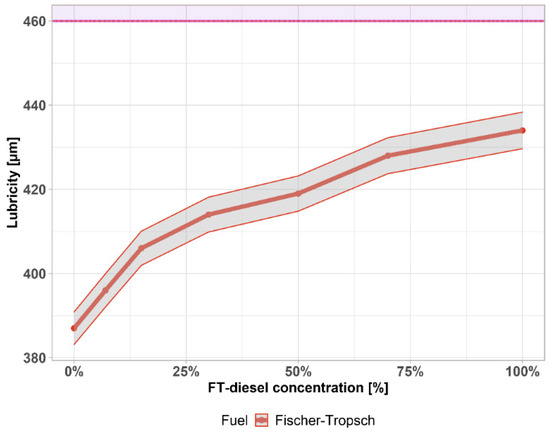 Lubricity is an important property of diesel that is necessary to ensure the proper functioning of fuel pumps and injectors. If diesel contains too many light components, there is a risk of damage to the moving parts of the fuel system due to reduced lubricity. The lubricity of FT-diesel is shown in Figure 8 with the 1% accuracy of the measurement shown by the gray area. According to the standard, the maximum permissible area diameter is 460 µm—shown by the purple area. FT-diesel satisfies this requirement in the whole interval.