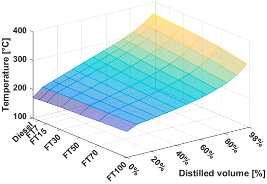 The distillation curve of both the pure and FT-diesel mixture was investigated as well. Schaberg et al., 2005, measured T10, T50, T95 and FBP for FT0, FT50, FT80, and FT100. Conventional diesel used by us contained a higher concentration of low volatile components, thus the distillation temperatures of all diesel mixtures have lower temperatures in T10 (avg. 5% lower) and T50 (avg. 9% lower) [51]. T95 and FBP were almost the same (~1% difference). The distillation curve for pure Fischer–Tropsch diesel was also measured by Gough and Bruno, 2012. A higher concentration of volatile compounds caused a higher distilled amount at lower temperatures [53]. This trend continued throughout the whole range of measured volumes.