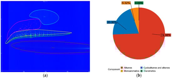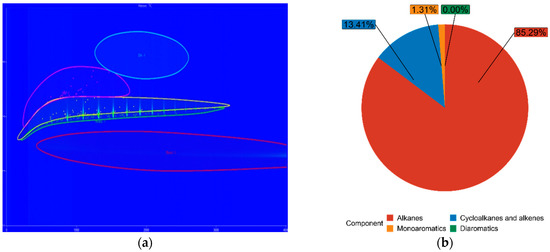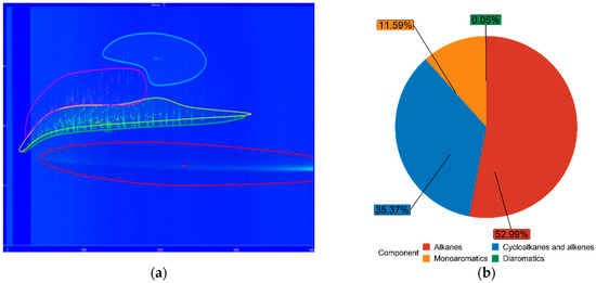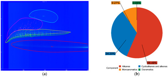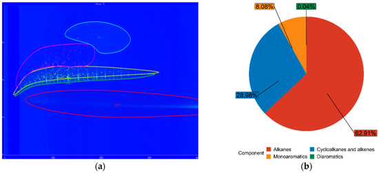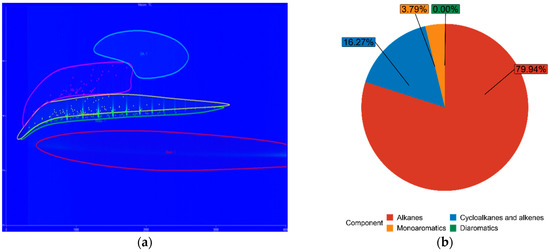 (a) Output of GC × GC-TOFMS for pure conventional diesel; (b) hydrocarbon composition of pure diesel.