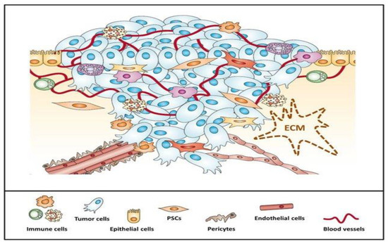 Pancreatic tumor microenvironment is composed of neoplastic cells surrounded by the abundant stroma at the cells that contribute to its development: pancreatic stellate cells (PSCs), immune cells such as neutrophils or lymphocytes, epithelial and endothelial cells and pericytes. Reprinted with permission from [24].