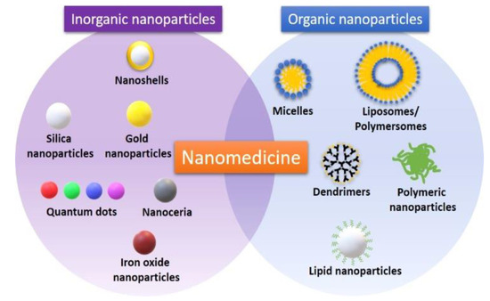 Examples of organic and inorganic nanoparticles used in the field of nanomedicine. Reprinted with permission from [32].