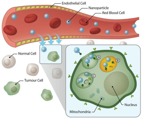 Delivery of magnetic nanoparticles, using active targeting, the process being facilitated the leaky vasculature. A: nanoparticle internalization leading to endosome development; B: High osmotic pressure and swelling of the endosome; C: release of the conjugated nanoparticles. Reprinted with permission from [104].