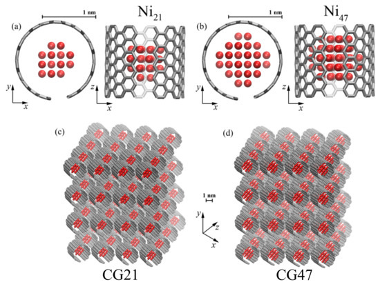 Initial structural unit—graphene flake filled with Ni nanoparticle Ni (a) and Ni (b) as the projection on and . (c,d) Structure of crumpled graphene filled with Ni—CG21 (c) and Ni—CG47 (d). Ni atoms are shown by red and C atoms—by grey color.