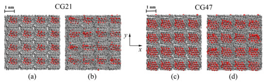 The graphene flakes (GFs) initially were armchair carbon nanotubes (11,11), cut along the z-axis to obtain a small flake. Graphene flakes filled with Ni nanoparticle were randomly rotated and translated times along the x-, y-, and z-axes correspondingly to obtain 3D initial structure shown in Figure 1c,d. For simplicity, crumpled graphene was filled with Ni labeled as CG21 and with Ni labeled as CG47. The total number of atoms for CG21 was 17,472, where = 16 128 and = 1344, and for CG47 was 19,136, where = 16,128 and = 3008. To avoid overlap, the graphene flakes were placed far from each other in the initial structure. However, these pores quickly disappeared during compression. It should be mentioned that an increase in the size of the computation cell by two times did not lead to significant changes in the results [39,40].