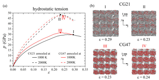 In Figure 3a, the pressure–strain curves during hydrostatics tension for Ni/graphene composites obtained by hydrostatic compression at 0 K followed by annealing at 1000 K (solid line) and 2000 K (dashed line) are presented. It can be seen that the increase in the annealing temperature leads to an increase in the ultimate tensile strength (). After annealing at 2000 K, the of CG21 (CG47) is 1.6 (1.5) times higher than at 1000 K. This can be explained by the fact that the annealing temperature 1000 K is not enough to melt a Ni particle [61] and not enough to mix carbon atoms and to form chemical bonds between carbon atoms. At the same time, such a temperature is sufficient to allow the spreading of Ni atoms inside the CG21 structure (see Figure 3b I).