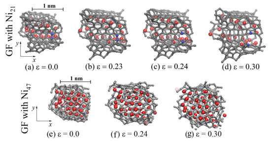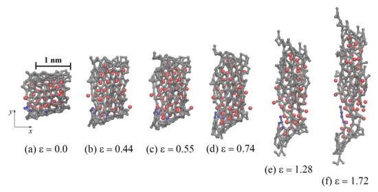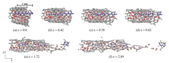 Figure 6a–f shows the structure of one graphene flake of the CG47 composite annealed at 2000 K during uniaxial tension along the x-axis. Atoms in blue show carbon atoms located along the zigzag direction of GF. Other graphene flakes after hydrostatic compression and annealing are oriented along the x-axis in almost the same way as in Figure 6. Tension along the x-axis of the entire composite corresponds to the zigzag direction of graphene flake edge, which can lead to significant elongation of the obtained Ni/graphene structures to a strain of 3.5. As can be seen, bonds are straightened along x-axis before < 0.5–0.6 (see bonds between blue carbon atoms in Figure 6a–c). Then, at > 0.5–0.6, breaks of old covalent bonds and the formation of new bonds are observed (see Figure 6d–f). In this case, the hexagonal carbon rings are rearranged into other configurations, forming a complex defect structure. At high strains ( > (1.5–1.6)), long carbon mono-chains are formed (Figure 6f) and amorphization of the graphene structure took place. Such monoatomic carbon chains are formed under large tensile strains, just before the fracture [62,63]. In Figure 6f, single carbon atoms belong to the neighboring GFs, which are not shown.