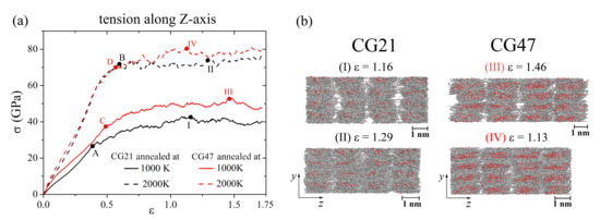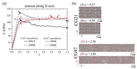 (a) Stress-strain curves during uniaxial tension along x-axis for CG21 (black curves) and CG47 (red curves) after annealing at 1000 K (solid line) and 2000 K (dashed line). (b) Snapshots of CG21 (A,B) and CG47 (III,IV) composites. Colors as in Figure 1.