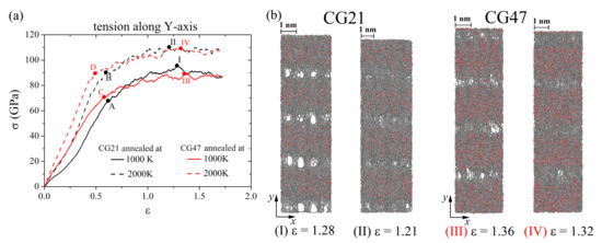 (a) Stress-strain curves during uniaxial tension along y-axis for CG21 (black curves) and CG47 (red curves) after annealing at 1000 K (solid line) and 2000 K (dashed line). (b) Snapshots of CG21 (I,II) and CG47 (III,IV) at the ultimate tensile strength. Colors as in Figure 1.