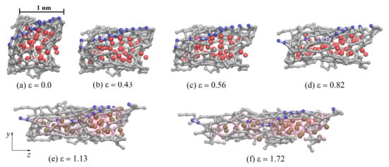During uniaxial tension of the Ni/graphene composites to the strain at points A, B, C, and D in Figure 7a, the structure is stretched without the formation of pores between the graphene flakes. From Figure 8a, it can be seen that GF is oriented by the armchair edge along the y-axis (along the loading direction). Tension of the composite results in a break in the carbon interatomic bonds (see Figure 8), the appearance of new bonds, and the formation of long carbon chains. Carbon atoms in these chains are separated by alternating single and triple bonds, which corresponds to a polyynic configuration [62,63]. Such a bond transformation is irreversible and leads to a sharp change in the stress–strain curves (see Figure 7a). At > 0.5, the formation of new structural elements composed of carbon atoms is observed, which differ from the graphene hexagonal structure (Figure 8c–e). At , the carbon structure is close to the amorphous state (see Figure 8f). Such a carbon structure transformation upon tension results in a strong elongation of the Ni/graphene composite by more than 170%. The Ni nanoparticle is destroyed during uniaxial tension and Ni atoms are uniformly distributed over the graphene surface. A similar transformation is observed for the Ni.
