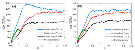 Stress–strain curves for Ni/graphene composite CG21 (a) and CG47 (b) after annealing at 2000 K. Here, is for uniaxial tension along x, y and z and p is for hydrostatic tension.