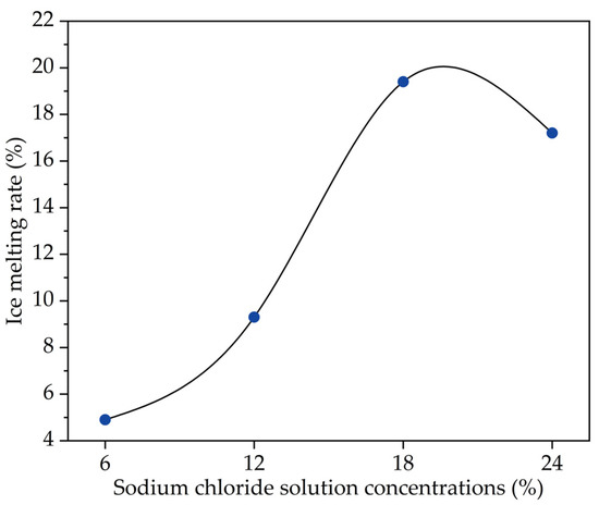 This study used sodium chloride snow melting salt to investigate the influence of chloride salt concentration on the performance of asphalt. Following the Chinese specification of “Salt of ice and snow melting for road” (GB/T 23851-2009) [26], the dissolution rate of chloride salt (snow melting salt) is 6.955 g/min, which meets the specification requirements. In general, the concentration of snow melting chloride salt determines the deicing performance to a large extent. The SEM image of snow melting chloride salt is shown in Figure 1. Figure 1 shows that the surface of snow melting chloride salt is relatively smooth with few particles attached, and it is easy to connect with water molecules [27]. At the same time, snow melting chloride salt would be easier to enter into the interior of pavement materials [27]. In order to explore the deicing ability of snow melting chlorine salt at different concentrations, the following experiment was designed for analysis: (1) an amount of 100 mL of water was added into a container of the same size and placed at −10 °C in a low temperature incubator until freezing. (2) After 12 h, different chloride salt solutions with concentrations of 6%, 12%, 18% and 24% were poured into four containers with ice cakes. (3) These containers with ice cakes and chloride salt solutions were placed in constant temperature environment at 0 °C for 0.5 h, and the ice melting volume could be measured. The ice melting rate is calculated by the ratio of ice melting volume to ice volume. The snow melting ability of chloride salt solutions with different concentrations of is shown in Figure 2.