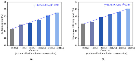 The variation of high-temperature performance with different chloride salt concentrations: (a) softening point; (b) equivalent softening point.