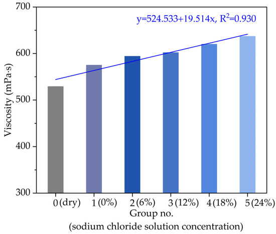 In order to further analyze the influence of chloride snowmelt salt on the high-temperature performance of asphalt, in addition to the softening point, the viscosity of asphalt at 135 °C were also measured according to T0625-2011 of Chinese specification (JTG E20-2011). The viscosity variation of asphalt at 135 °C with different chloride salt concentrations is shown in Figure 4.