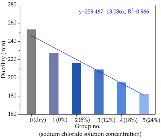 According to the experimental method (T0605-2011) of Chinese specification (JTG E20-2011), the measured ductility results at 10 °C of asphalt with different chloride salt solution concentrations are plotted in Figure 5. As can be seen from Figure 5, with the increase in the chloride salt solution concentration, the ductility at 10 °C of the asphalt sample presents a strong linear variation trend with R2 of 0.966. Compared with the control group (Group No. 0), the ductility at 10 °C of the asphalt sample decreases by 9.2%, 13.6%, 17.2%, 23.3% and 27.6% when the chloride salt solution concentration increases from 0% to 24%, respectively. The ductility variation of asphalt depends on the chloride salt solution concentration. The ductility at 10 °C of the asphalt soaked in a higher concentration of chloride salt solution is significantly lower than that of the control group (dry asphalt sample).