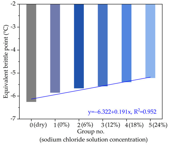According to the fitting parameters in Table 2, the calculated equivalent brittle points T1.2 of asphalt with different chloride salt concentrations are plotted in Figure 6. From the overall variation trend in Figure 6, the equivalent brittle point T1.2 of asphalt sample presents a linear relationship with the increase in the chloride salt solution concentration, in which R2 of 0.966. Similarly, the chloride ions in the chloride salt solution contain crystals with large sizes among asphalt molecules, which have poor plasticity. Due to the change of asphalt components, the equivalent brittle point T1.2 of asphalt decreases with the chloride salt solution concentration.