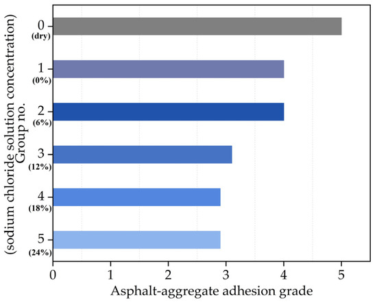 The boiling method was adopted in this study to evaluate the adhesion property between asphalt and aggregate according to T0616-2011 of JTG E20-2011 (similar to ASTM D3625). The limestone aggregates were used in this study, the corresponding geological nature and some characteristics have been introduced in the previous study [28]. The asphalt–aggregate adhesion grade of asphalt varying with different chloride salt concentrations is shown in Figure 8.