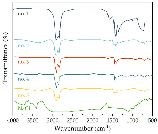 Infrared spectroscopy (IR) can react with the molecular structure of materials, which can effectively detect the structure of complex molecules [34,35]. In this study, according to “General rules for infrared analysis” (GB/T 6040-2002) [36], the infrared spectroscopy of asphalt samples soaked in different chloride salt solution concentrations were measured by Fourier transform infrared spectrometer to observe the changes of the molecular structure of asphalt.