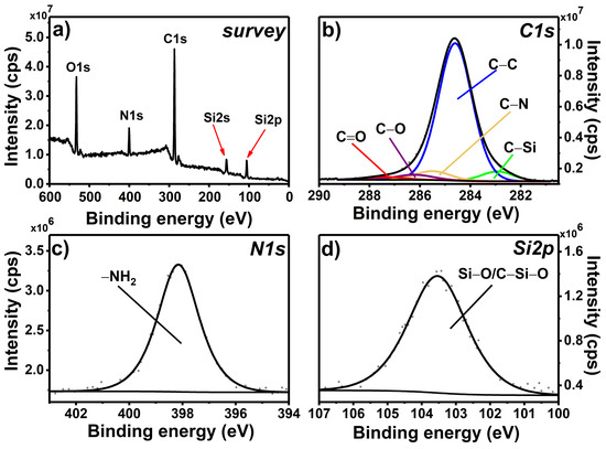 The decomposition of the high-resolution C1s spectrum (Figure 1b) shows five components at 282.9, 284.8, 285.5, 286.2, and 287.5 eV attributed to C–Si, C–C, C–N, C–O, and C=O, respectively. C–N and C–Si components, being in the ratio close to 1, are characteristic for the APTES monolayer [33,34,38], while C–C and C–O come from the grafted organic layer and the adventitious carbon residues [38]. Low content of the C–O component, approximately 3.4%, suggests that almost all –OC2H5 groups present in the APTES molecule are involved in the grafting process, forming a covalent bond either with the glass surface atoms or with each other [33].