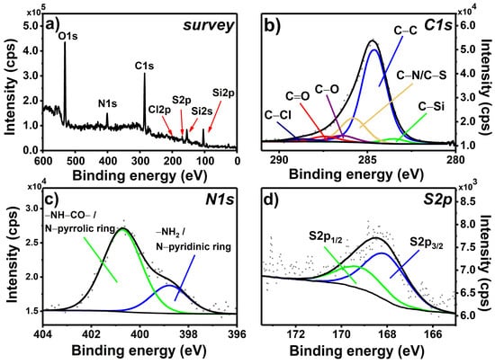 XPS survey spectrum (a) and high-resolution spectra of C1s (b), N1s (c), and S2p (d) regions registered for the MIX_TC_APTES@glass monolayer.