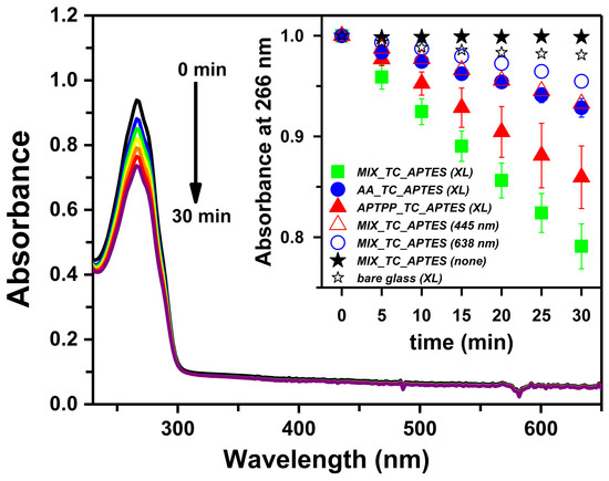 Figure 5 presents an exemplary UV–Vis spectrum recorded for the α-terpinene solution in acetonitrile in contact with the MIX_TC_APTES@glass coating during illumination with the xenon lamp (XL). The clear decrease in the α-terpinene absorbance at 266 nm with time indicates its oxidation by ROS species being produced by the MIX_TC_APTES@glass monolayer. Notably, under applied conditions, only a small drop in the absorbance of α-terpinene, due to its autooxidation, was observed when the unmodified glass was irradiated (Figure 5 inset). As no new bands appear in the UV–Vis spectra at approximately 400 or 600 nm, the degradation of the photoactive layer, resulting in the release of the bound photosensitizers into the solution of the chemical trap, can be excluded. The consistency of the results obtained for the ROS production by the MIX_TC_APTES@glass monolayer under xenon lamp illumination indicates the reproducibility of the layer formation process. Moreover, almost no changes in the UV–Vis spectra during the so-called dark test were detected (Figure 5 inset), which confirms that ROS are produced only when the chemically grafted photosensitizers, i.e., AA and APTPP, are activated by the light.