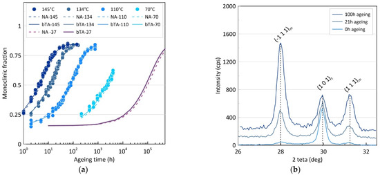 Figure 2 shows the experimental results of ageing tests at T = 70, 95, 110, 134, and 145 °C for different ageing times. As expected, the amount of monoclinic phase increases with both time and temperature. The curves were fitted using the MAJ Equation (Equations (1) and (2)) with a monoclinic content ranging from 17 to 84 volume percentage. Two fitting methods were applied. The first one (numerical analysis, NA) consisted of adjusting five parameters simultaneously—n, b0, Q, fmin, and fmax—by fitting all the kinetics simultaneously (using the Generalized Reduced Gradient method implemented in Microsoft Excel solver) while setting an equal weight to each temperature in the error minimization process [17]. The second one (b-T analysis—bTA) is the analysis usually applied [11]. It consists of first determining fmin and fmax (from the initial and saturation values of f), then n for each kinetic (using the slope of the versus ln(t) diagram). Then, a common value of n was decided (the average value for all kinetics) and b was calculated for each kinetic (from the intercept of the versus ln(t) diagrams, imposing the chosen value of n). Finally, plotting ln(b) versus (1/T) gave access to both b0 and Q. The values of the five parameters found using these two adjustment methods are reported in Table 1. This table shows no significant difference between the two sets of parameters. The experimental points and fits are shown in Figure 2. The same figure also shows the ageing kinetics extrapolated to 37 °C, using the two sets of parameters (bTA-37 and NA37).