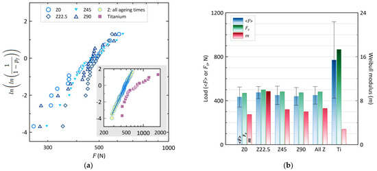 Weibull analysis of the fracture load of zirconia implants. (a) Weibull plots for all implants; the main graph shows the individual Weibull plots for zirconia implants with different ageing times; the inset (with same axes as the main graph) shows the Weibull plot for all zirconia implants together and for titanium implants. (b) Average fracture loads (<F>), central Weibull value (F0) and Weibull moduli (m) on all implants (“All Z”: parameters calculated on all zirconia implants together, regardless of the ageing time).